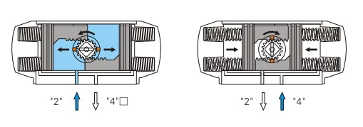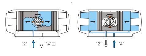 當(dāng)氣源壓力從氣口(2)進(jìn)入氣缸兩活塞之間中腔時(shí),使兩活塞分離向氣缸兩端方向移動(dòng),兩端氣腔的空氣通過氣口(4)排除, 同時(shí)使兩活塞齒條同步帶動(dòng)輸出軸(齒輪)逆時(shí)針方向旋轉(zhuǎn)。反之氣源壓力從氣口(4)進(jìn)入氣缸兩端氣腔時(shí),使兩活塞向 氣缸中間方向移動(dòng),中間氣腔的空氣通過氣口(2)排除,同時(shí)使兩活塞齒條同步帶動(dòng)輸出軸(齒輪)順時(shí)針方向旋轉(zhuǎn)。 (如果把活塞相對(duì)反方向安裝,輸出軸變?yōu)榉聪蛐D(zhuǎn),即為雙作用反轉(zhuǎn)型)